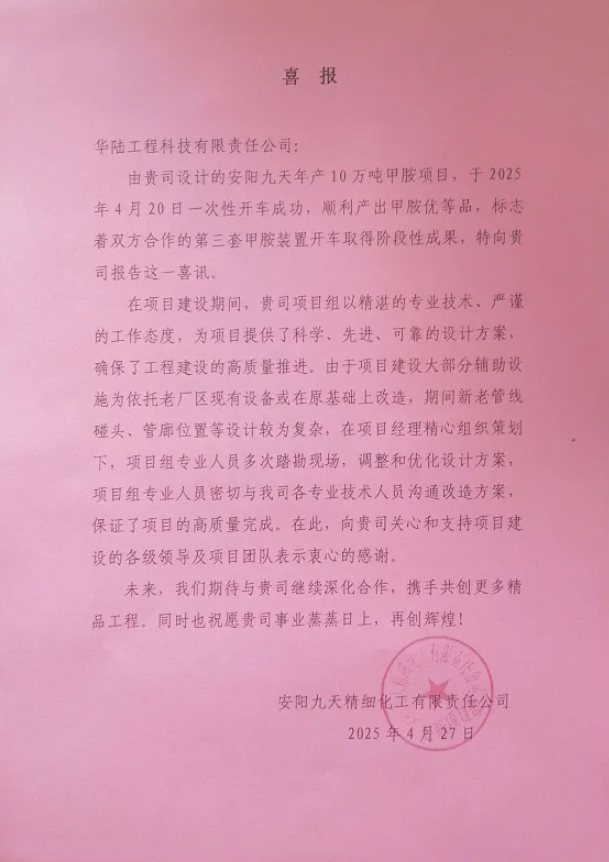 專有甲胺技術(shù)再結(jié)碩果!河南能源安陽園區(qū)九天公司年產(chǎn)10萬噸甲胺裝置順利投產(chǎn)